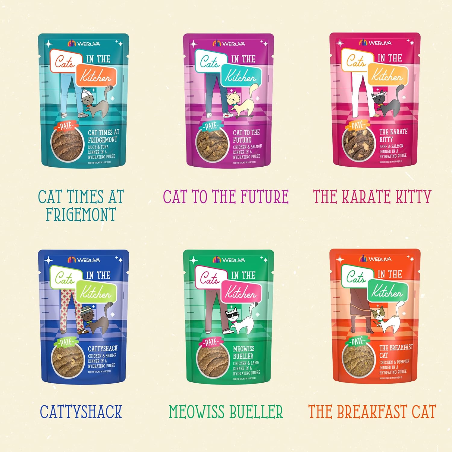 - Variety Pack includes 2 of each: The Breakfast Cat, Cat to The Future, Meowiss Bueller, Cat Times at Fridgemont, The Karate Kitty, and Cattyshack.
