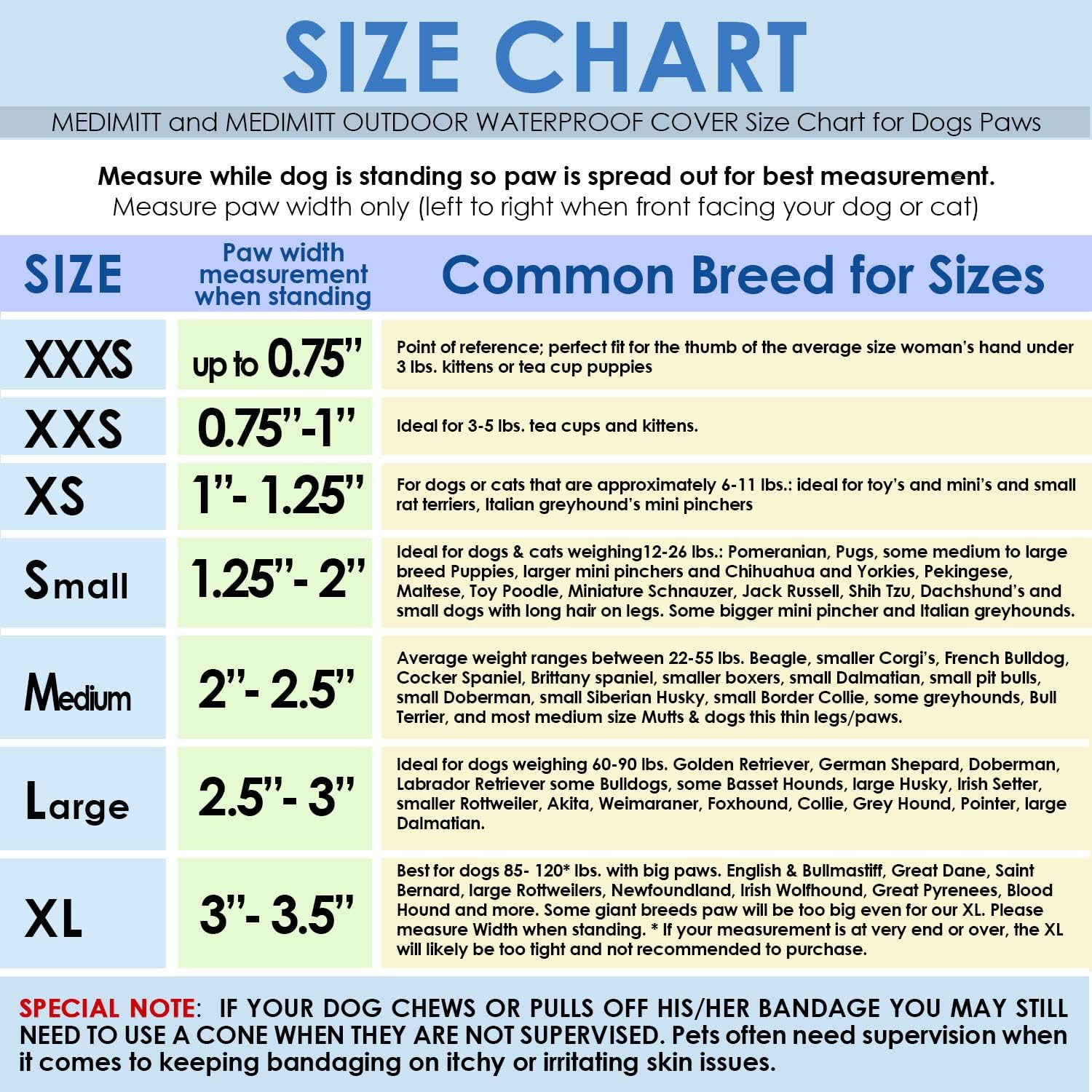 - SM: paw width measurement when standing: between 1.25” 2”. Ideal for dogs & cats weighing12-26 lbs.: Pomeranian, Pugs, some medium to large breed Puppies, larger mini pinchers and Chihuahua and Yorkies, Pekingese, Maltese, Toy Poodle, Miniature Schnauzer, Jack Russell, Shih Tzu, Dachshund’s and some Italian Greyhound, Rat Terrier. IF YOUR DOG CHEWS OR PULLS OFF HIS/HER BANDAGE YOU MAY STILL NEED TO USE A CONE WHEN THEY ARE NOT SUPERVISED.