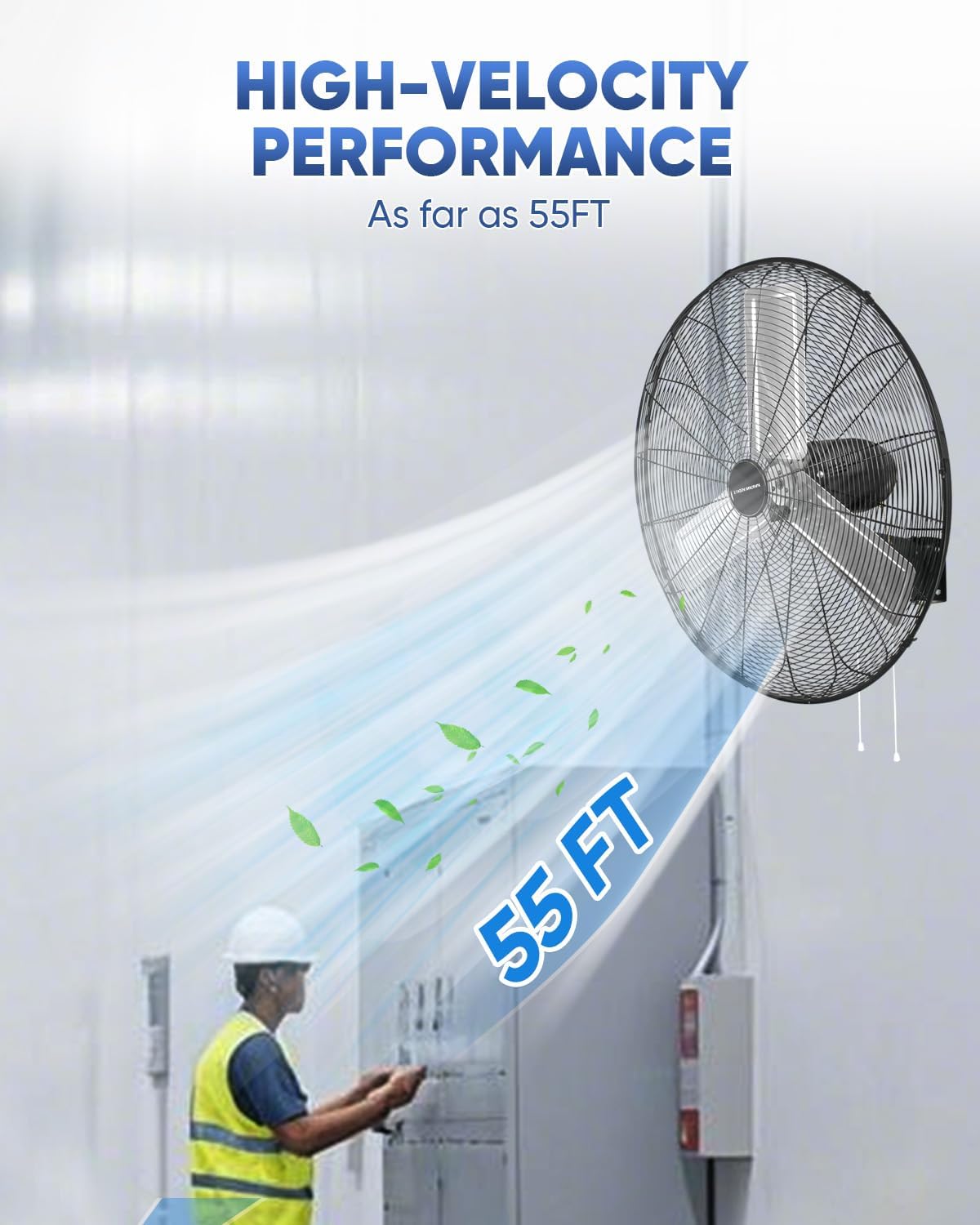 KEN BROWN 30 Inch Industrial Oscillating Wall Mount Fan - 7497 CFM High Velocity, Heavy Duty Metal Construction, 2 Speed Settings, Black