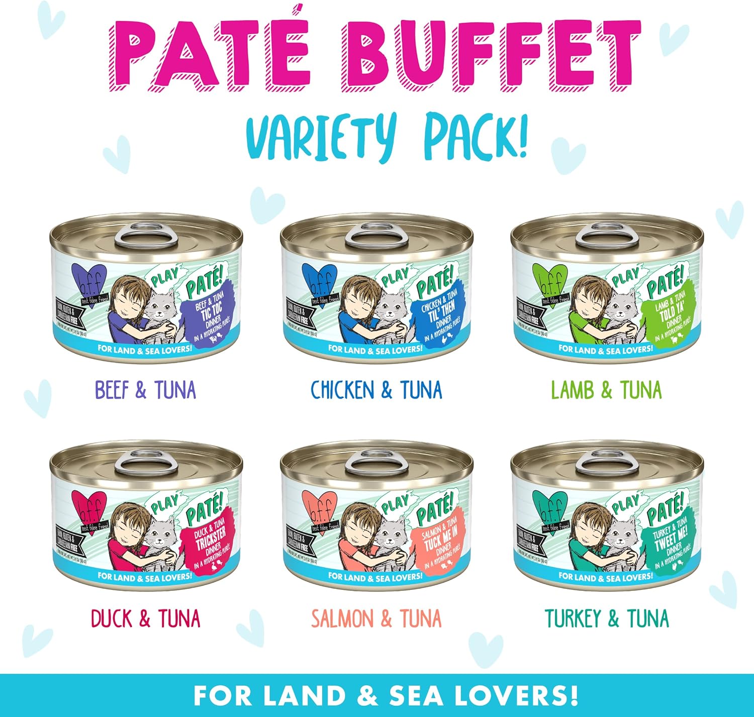 Weruva B.F.F. Play - Best Feline Friend Paté Lovers, Aw Yeah!, Play Paté Buffet Variety Pack, 2.8oz Can (Pack of 18)