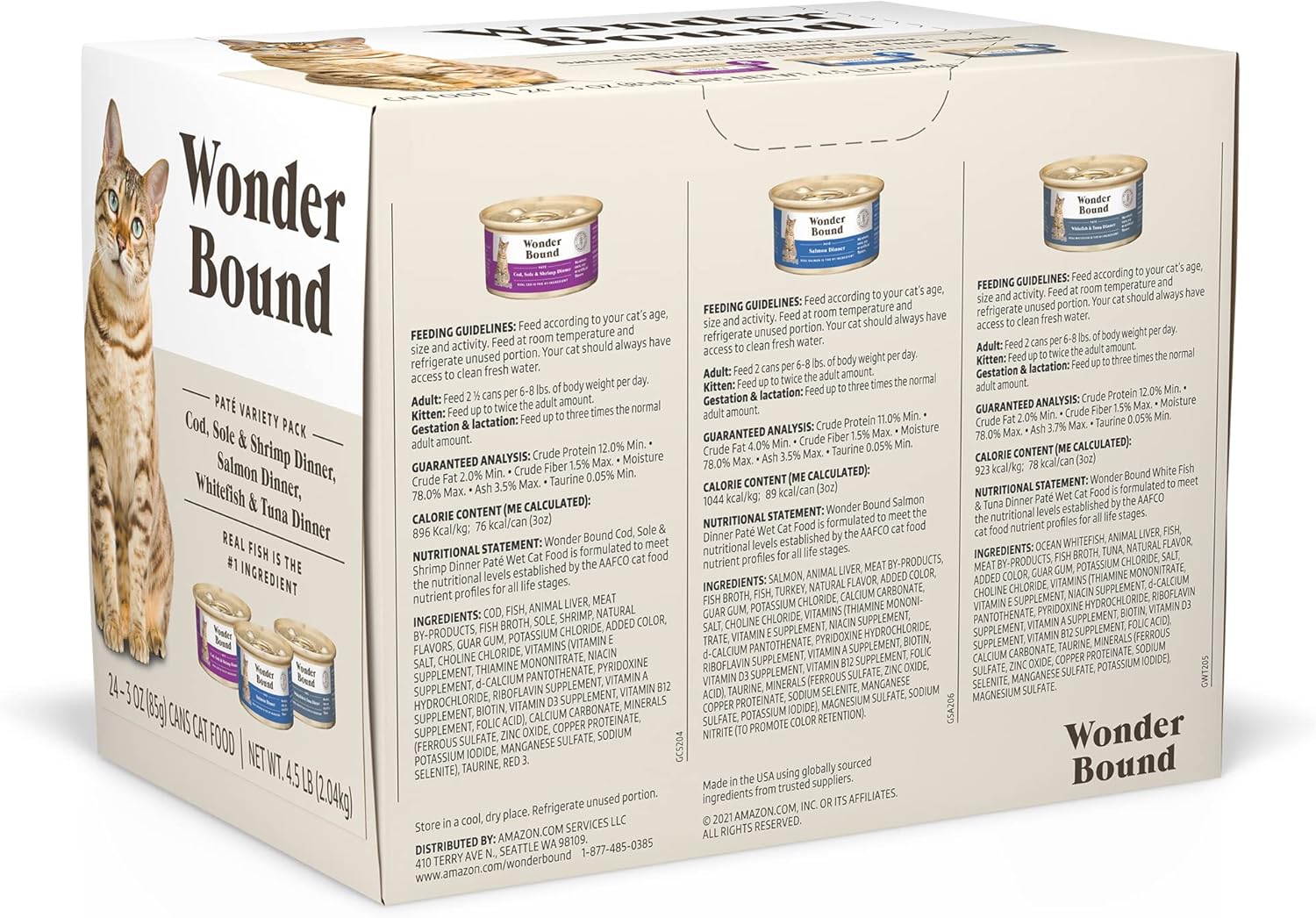 - 24 Pack of Wonder Bound Grain Free Cod, Sole & Shrimp, Salmon, White Fish & Tuna Patรฉ 3 oz cans, Variety Pack Wet Cat Food