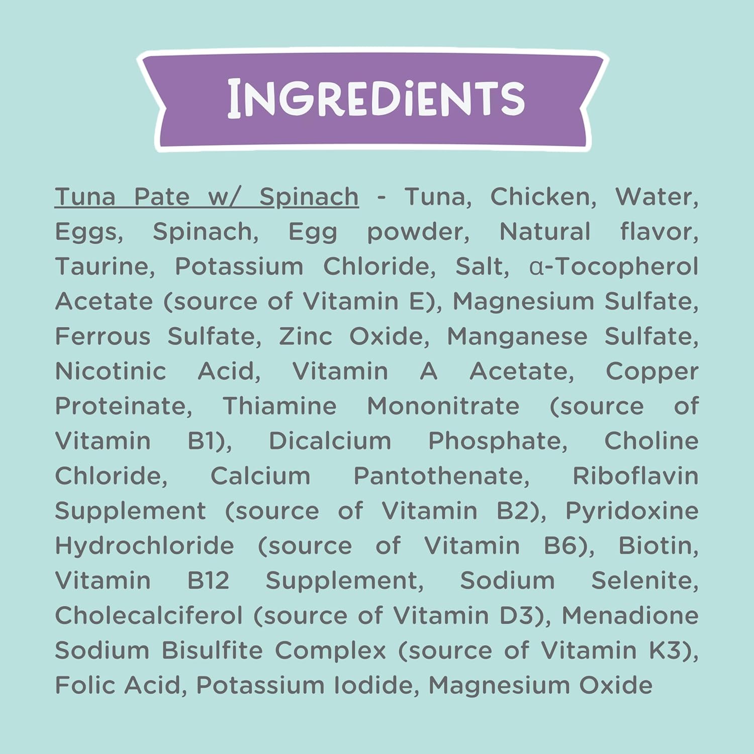 - GRAIN FREE & NON-GMO: Our pate tuna and spinach is prepared without any grains, artificial additives, or by-products, as our goal is to feed cats the way nature intended. We always source wholesome ingredients to promote optimal health and nutrition.