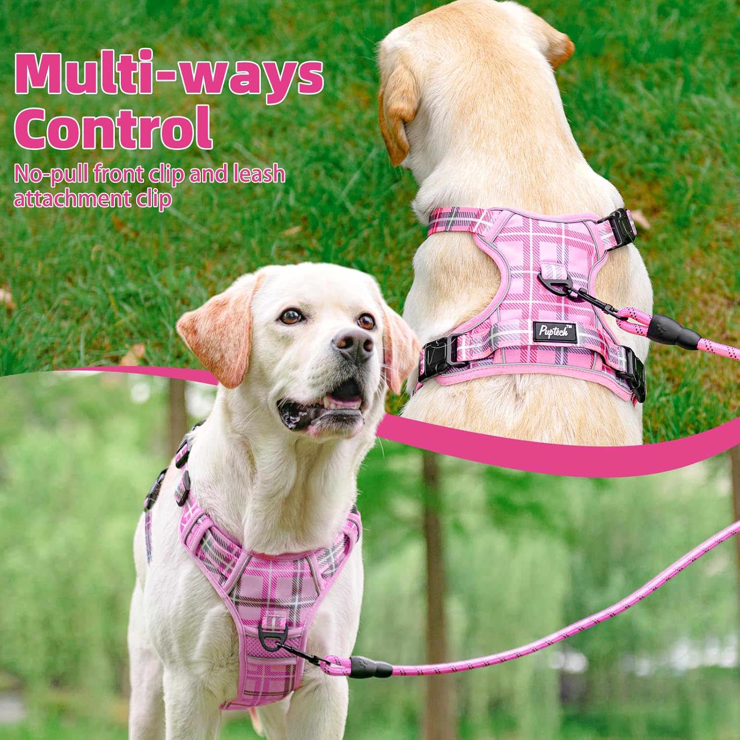 PUPTECK No Pull Dog Harness Medium Sized, Adjustable Reflective Dog Harness with Handle Easy Control, Comfortable Soft Padded Pet Vest Harness for Medium Dogs, Plaid Pink M