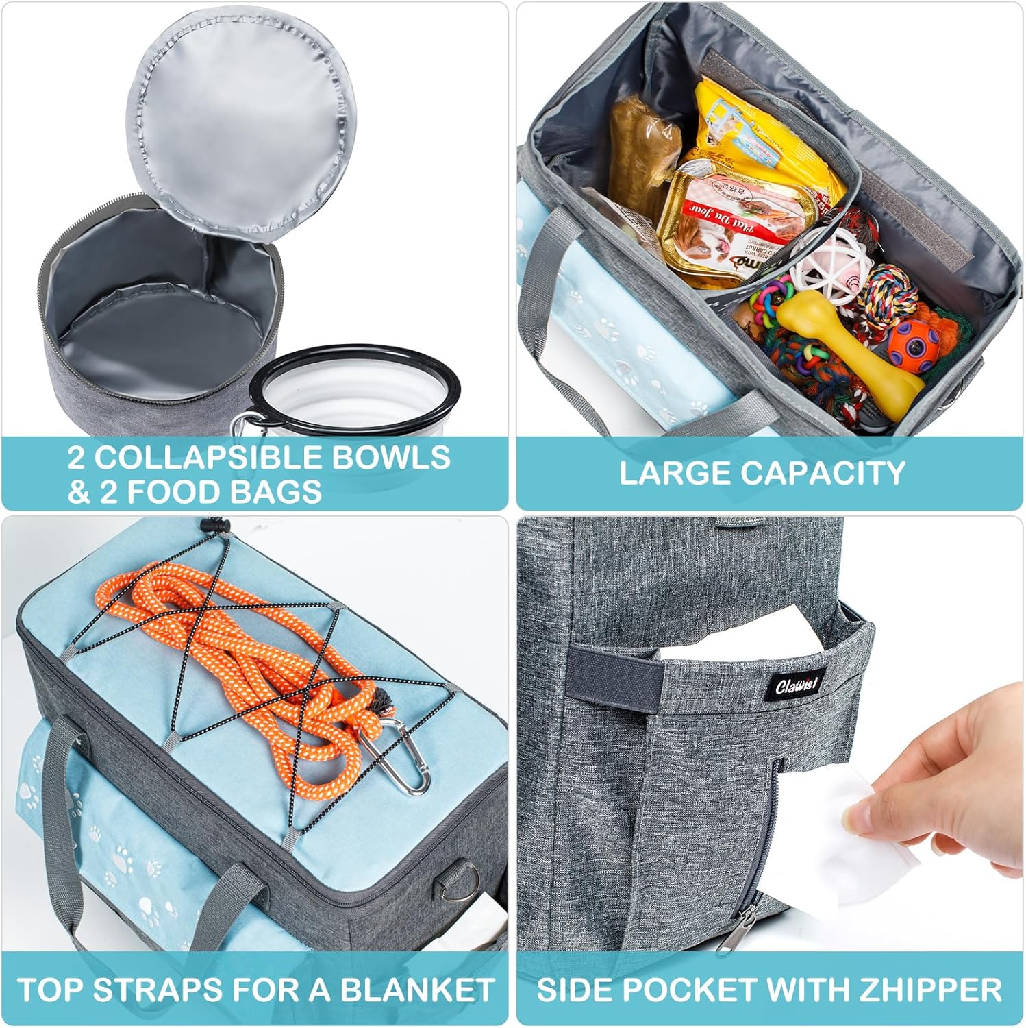 - WELL MADE - Clawist large dog travel bag is made with heavy-duty materials with padded lining. Carry it on your shoulder or by hand. The dog food bag is with PEVA lining which is easy to clean. The collapsible bowls are made of silicone and are dishwasher safe.