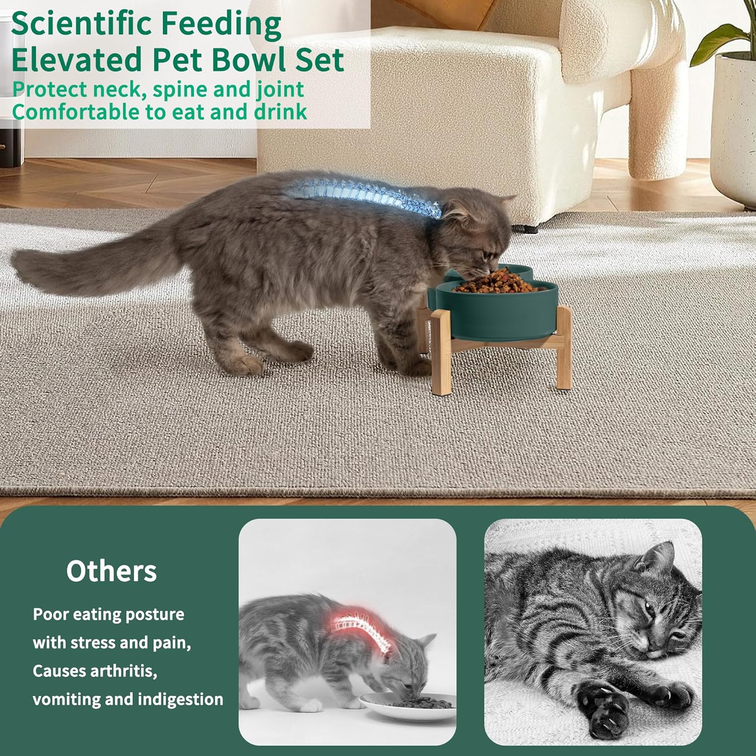 Elevated Ceramic Dog Bowl Set - Raised Feeding Bowls with Non-Slip Bamboo Stand - Small Pet Dishes for Food and Water - Ideal for Cats and Puppies - 16.23 OZ - 2 Cups - 480 ML