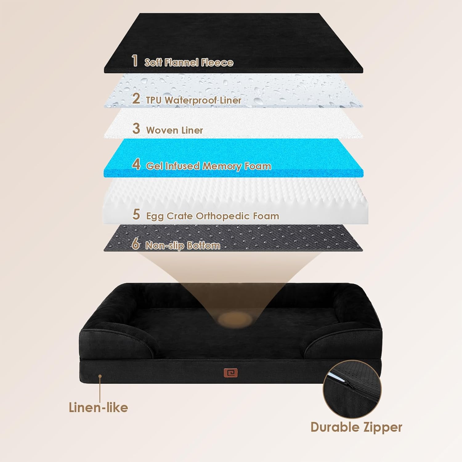 - WATERPROOF FILM and NON-SLIP BOTTOM: There is a waterproof film between the fleece surface and the bottom fabric that makes the dog bed waterproof. However, the faux linen on the side is not waterproof. A non-slip point on the bottom is not easy to slide, and keeps your dog bed steady.