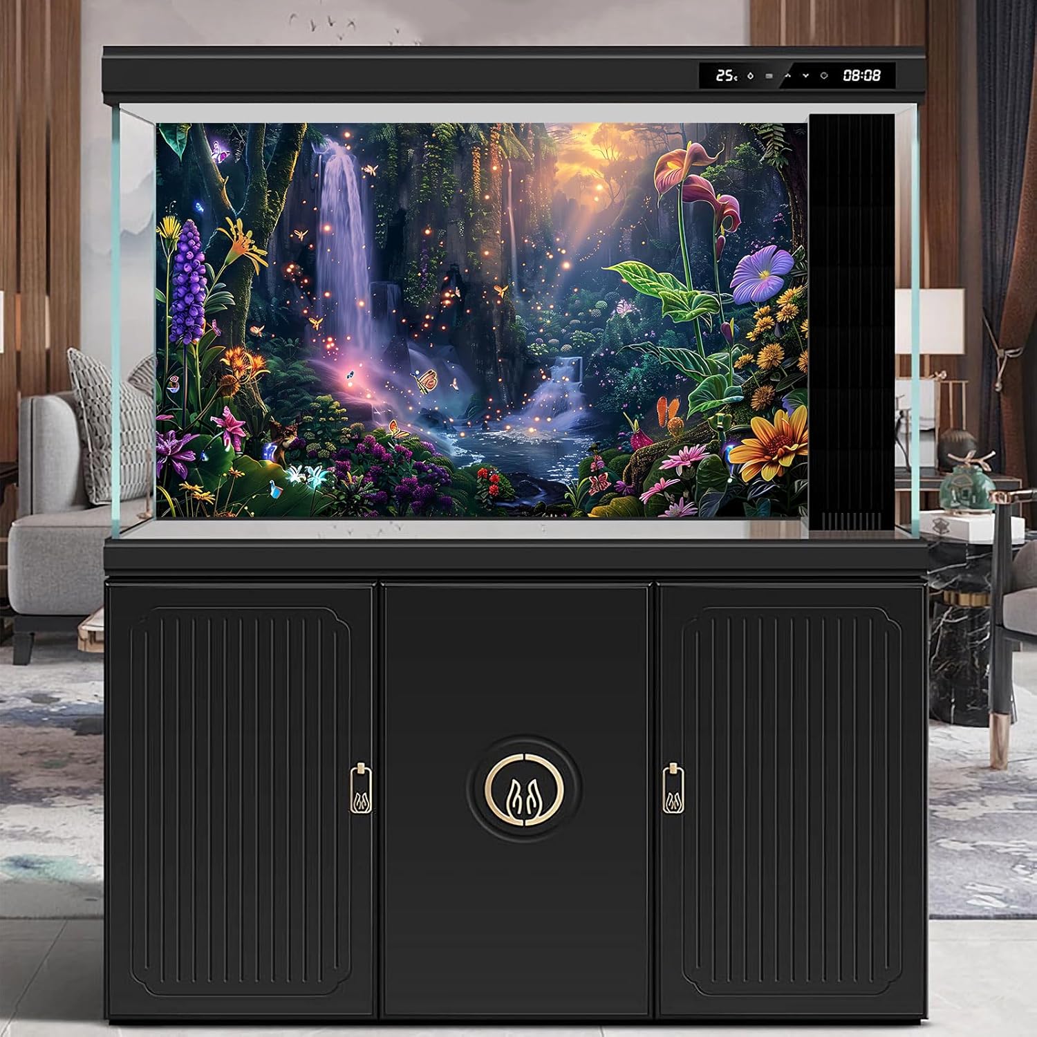 Fantasy Garden Aquarium Background Sunset Waterfall and Flowers Terrarium Backdrop Tropical Forest Lush Plant Magic Butterfly Lights Flowers Fish Tank Background Poster Decorations 36x20in