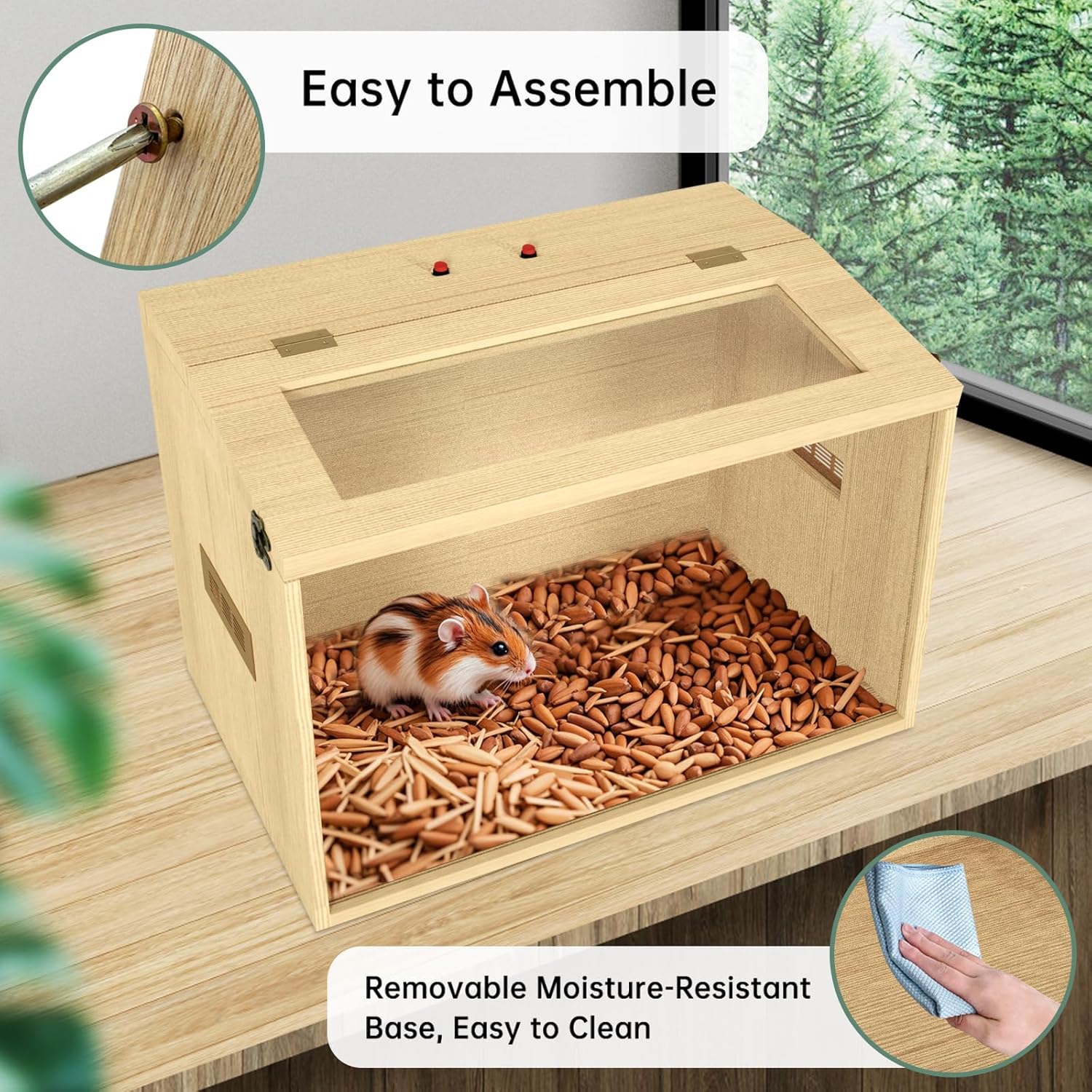 • Easy assembly and cleaning: Designed for easy assembly, it can be quickly installed by following the provided detailed instructions. The bottom of the hamster enclosure features a waterproof acrylic panel, making it convenient to clean and maintain your pet's hygienic living space