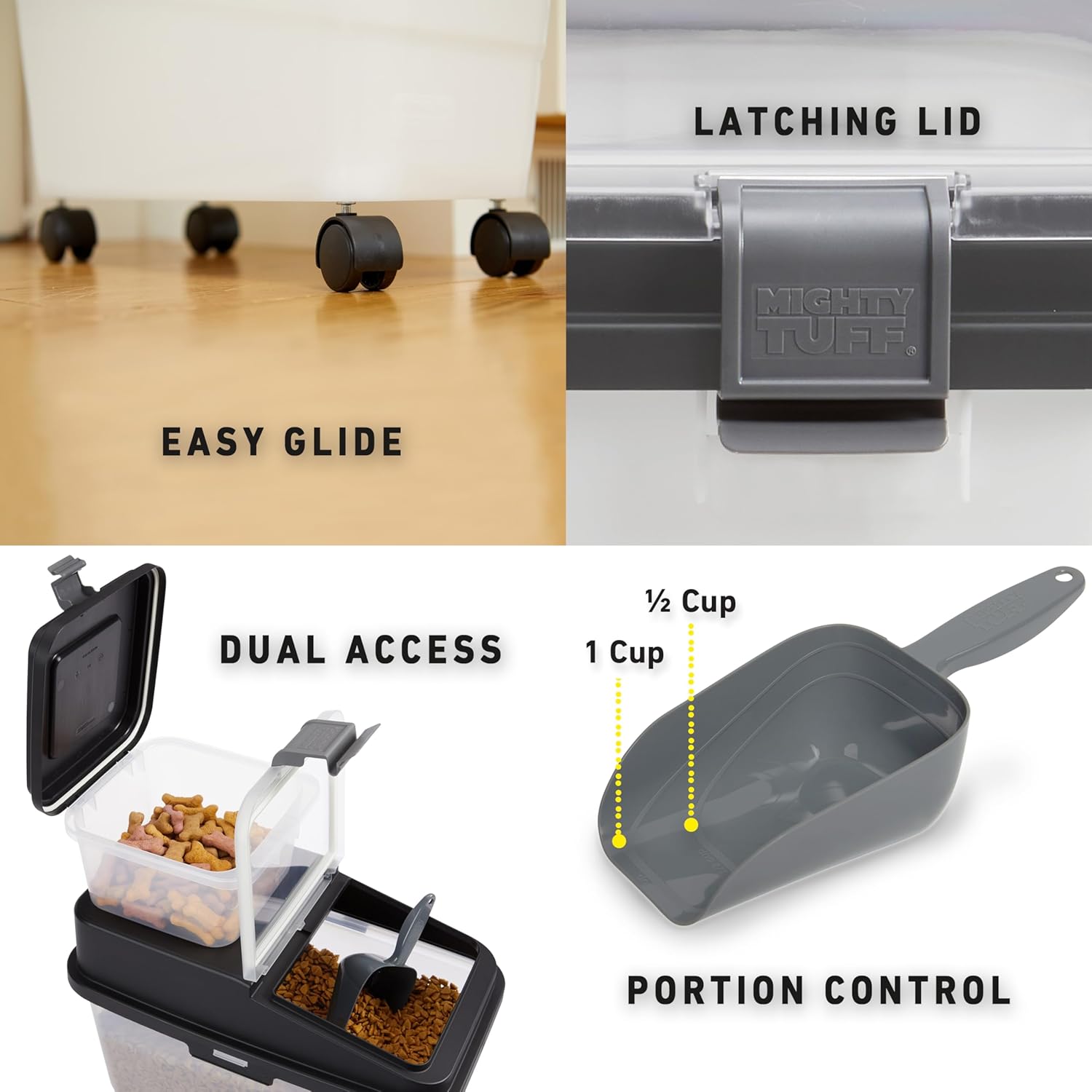 - VERSATILE: Suitable for storing dog food, cat food, bird seed, or other pet supplies, includes portion scoop with 1/2 and 1 cup markings