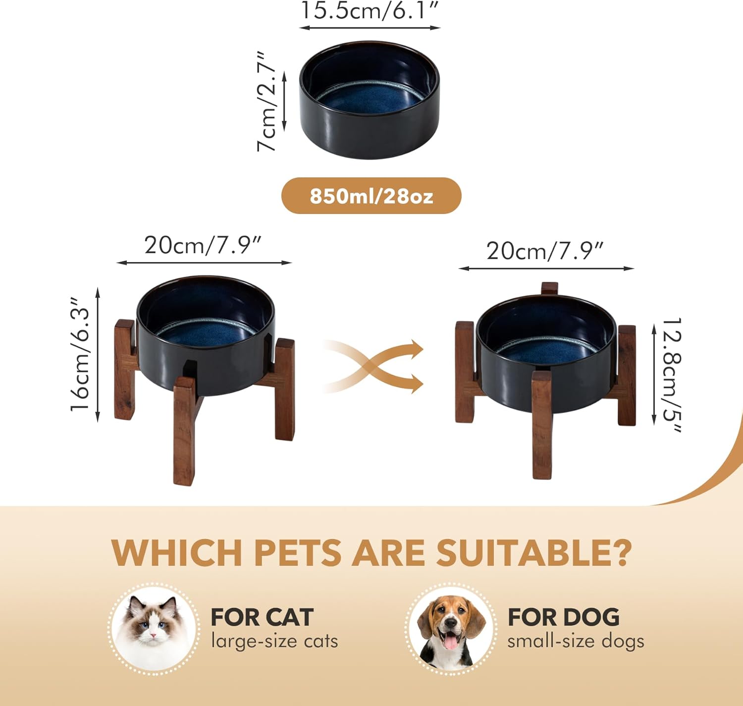 • Acacia Wood Stand: Adopting with classy acacia wood stand, this aesthetically pleasing ceramic dog bowls with stand fits perfectly with any home decor style. By flipping the stand over , you can get 2 different heights to hold the pet bowl. Letβ€˜s elevated bowl company with your pet in different growth stages.
