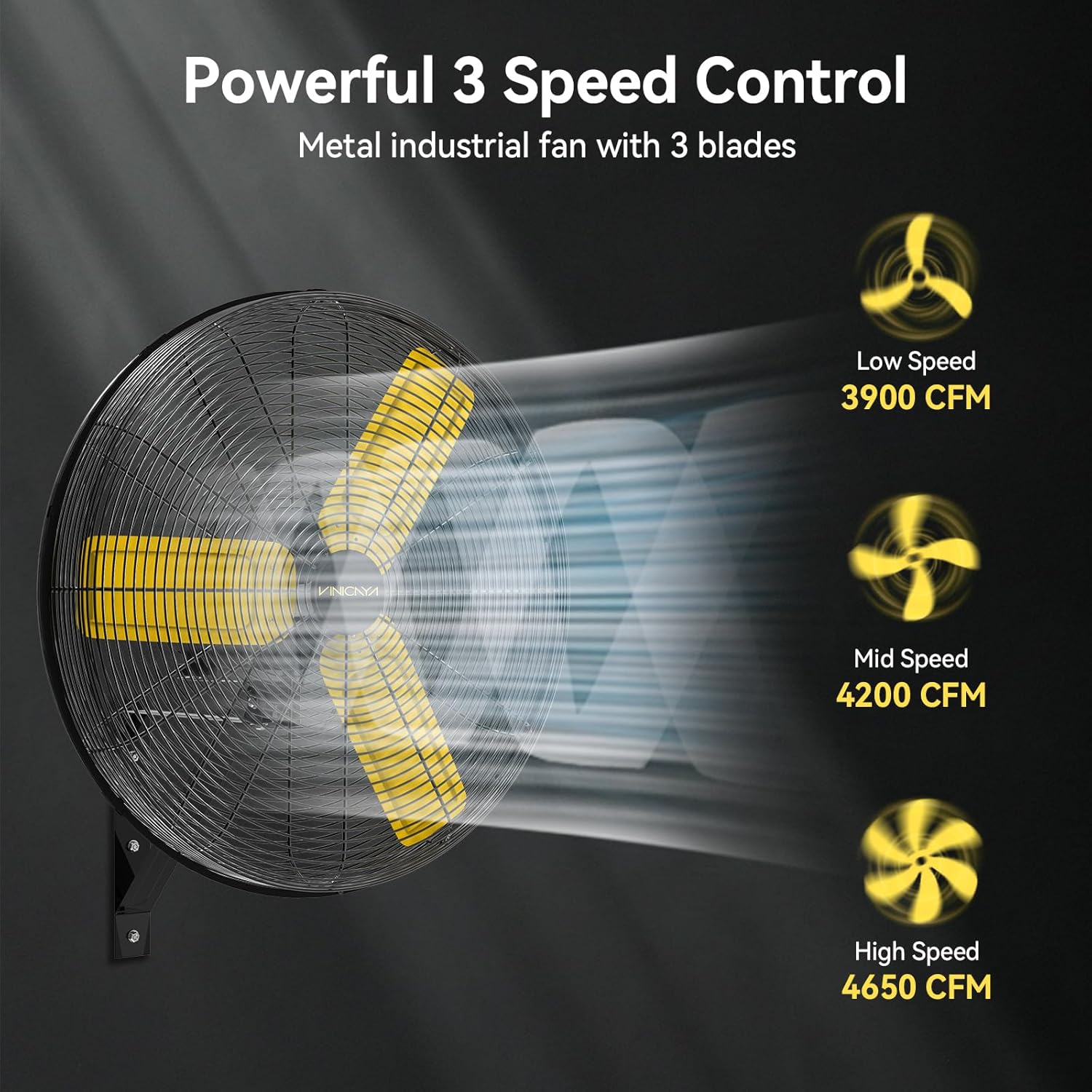 - 3 Speed Control: Offers three speed settings (low-7000 CFM, medium-7400 CFM, and high-9000 CFM) to allow you to customize the airflow intensity based on your specific cooling or ventilation requirements on the wall mount fan