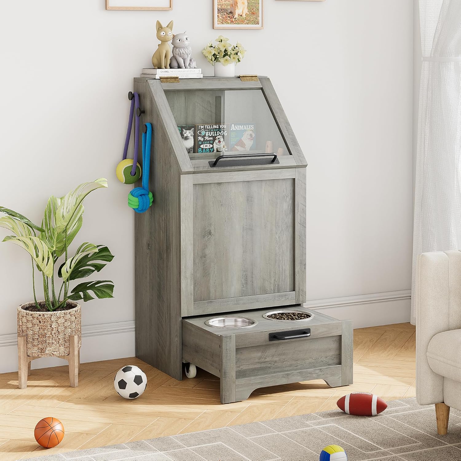 - Hidden Pet Feeding Station: The dog feeding station offers an internal storage space of 14.75 x 12.79 x 14.96 inches, perfect for storing most dog food bags and includes shelves for organizing pet cans and toys, keeping all pet supplies neatly arranged.